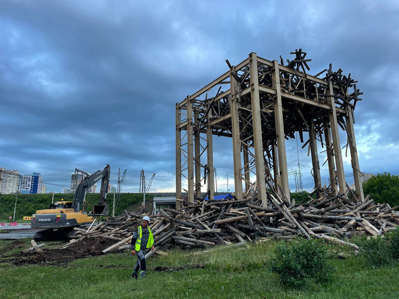 Напомним, вечером 19 июня подрядчик начал сносить арт-объект «Пермские ворота». Он попал в зону строительства транспортной развязки, которая будет выходить на новый мост через Каму. Пермяки в качестве сувениров стали разбирать щепки и даже брёвна, оставшиеся от снесённого арт-объекта, делать селфи и выкладывать фото в сеть.