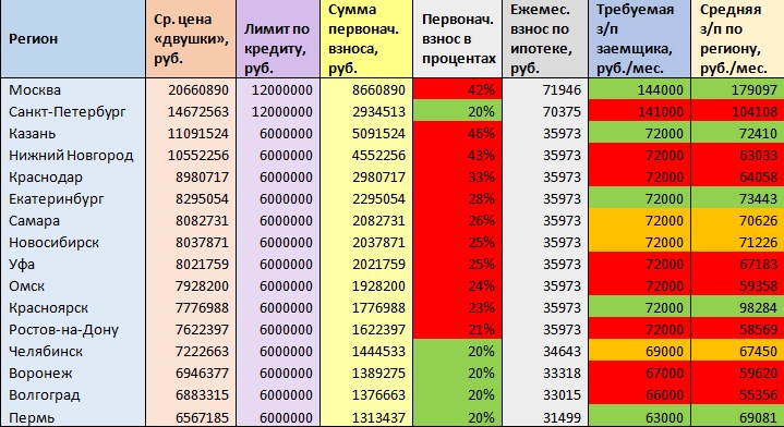 По условиям семейной ипотеки, сумма кредита для Москвы и Санкт-Петербурга составляет 12 млн руб., а для остальных городов — 6 млн. Но на хорошую двухкомнатную квартиру с первоначальным взносом в 20% этой суммы хватит не везде. В столице для покупки «двушки» по средней цене 20,6 млн руб. первоначальный взнос должен составлять 8,6 млн руб. (42% от цены квартиры). В Казани это порядка 46%, в Нижнем Новгороде — 43%, в Краснодаре — 33%, в Красноярске — 23%, в Ростове-на-Дону — 21% — то есть в 11 миллионниках из 16.
