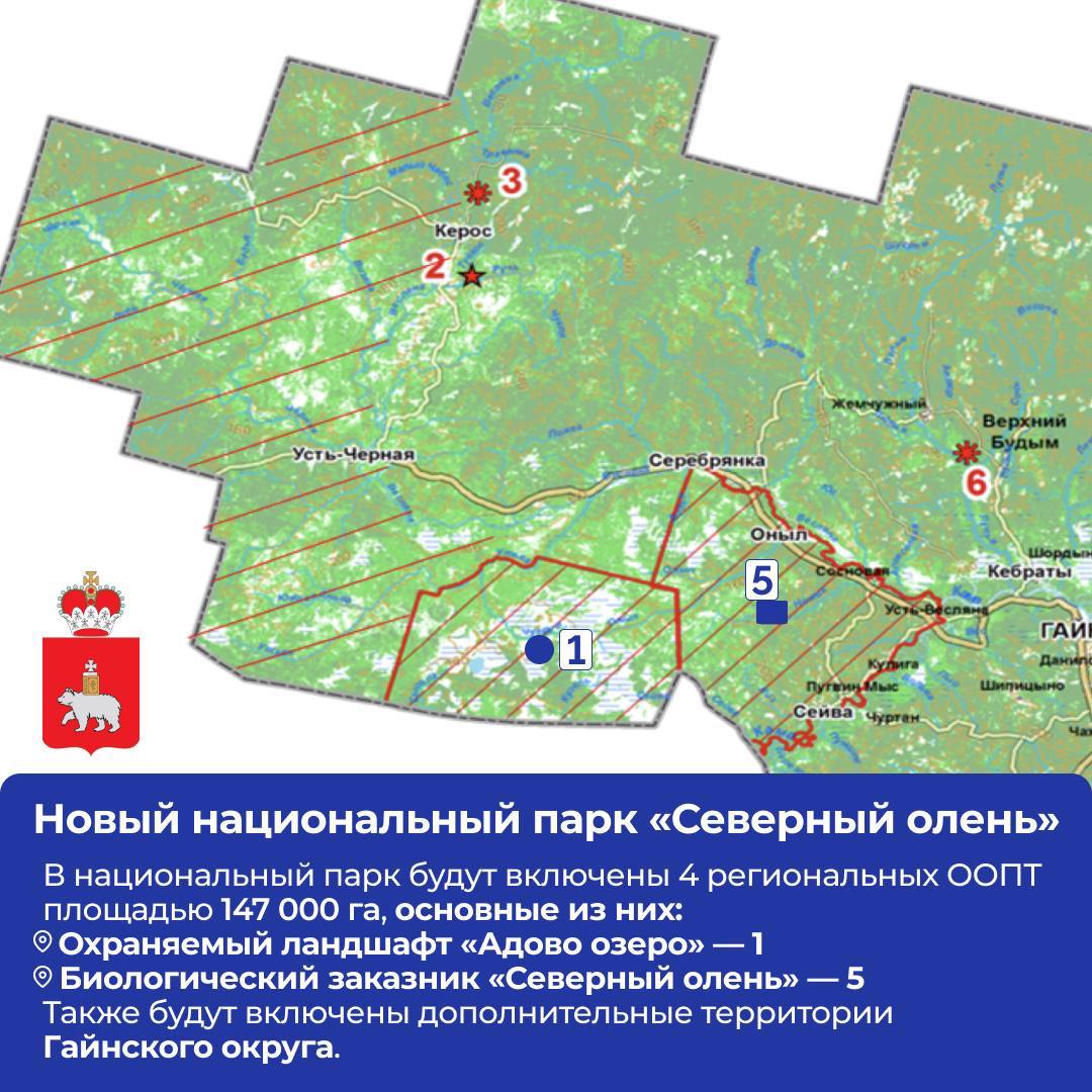 «Предлагаем Минприроды России создать на базе этих двух ООПТ национальный парк «Северный олень» — включить в его границы прилегающие территории Гайнского округа, охватив при этом пути миграции северного оленя», — написал губернатор.