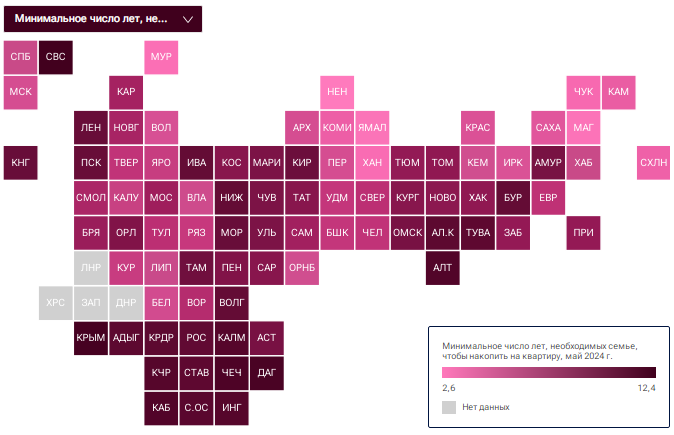 В целом аналитики отмечают рост потенциальной доступности жилья для семей с одним ребенком к маю 2024 года в большинстве регионов. По сравнению с прошлым годом минимальный срок, за который можно накопить на квартиру площадью 60 кв. м, снизился в 82 субъектах. В двух регионах он увеличился, а в ЯНАО не изменился.