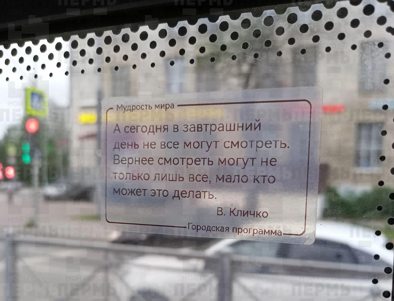 В Перми неизвестные лица наклеили на окна двух трамвайных вагонов цитаты мэра Киева Виталия Кличко, а также английского актёра Джейсона Стэйтема. Перевозчик оперативно удалил надписи из салона. Об этом «Новому компаньону» сообщили в МУП «Пермгорэлектротранс».