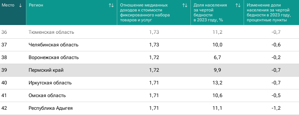 Динамика доли бедного населения показала, что в среднем в Прикамье доля жителей за чертой бедности сократилась на 0,7 процентного пункта по сравнению с 2022 годом. Отношение медианных среднедушевых месячных доходов населения региона к стоимости фиксированного набора товаров и услуг в целом составило 1,72. В рейтинге регионов по уровню доходов населения Пермский край занял 39 место.