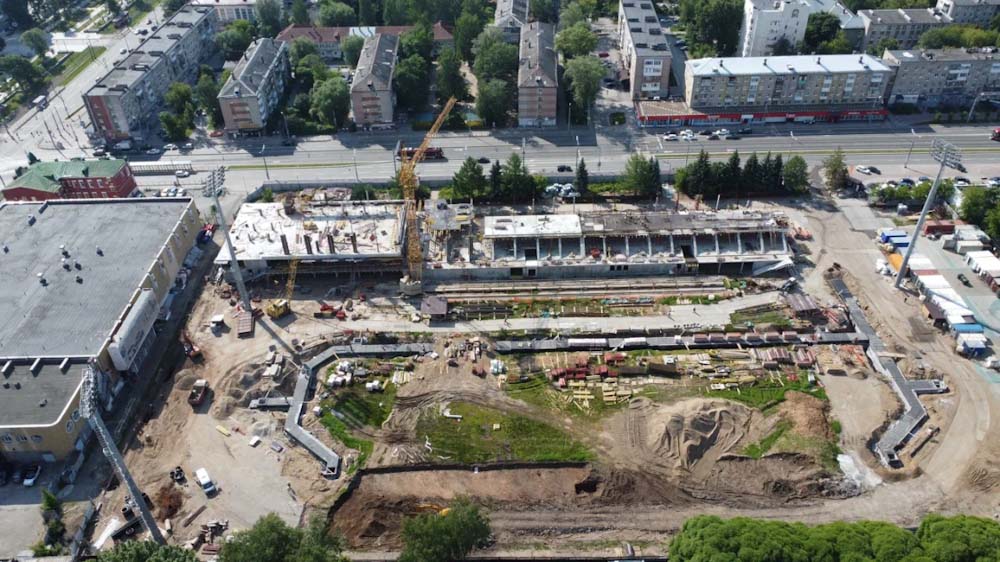 Также в данный момент на объекте продолжается строительство каркаса административного здания, опор под трибуны и труб для канала хладоснабжения. Следующим этапом планируется устройство основания основного овала и поля.
