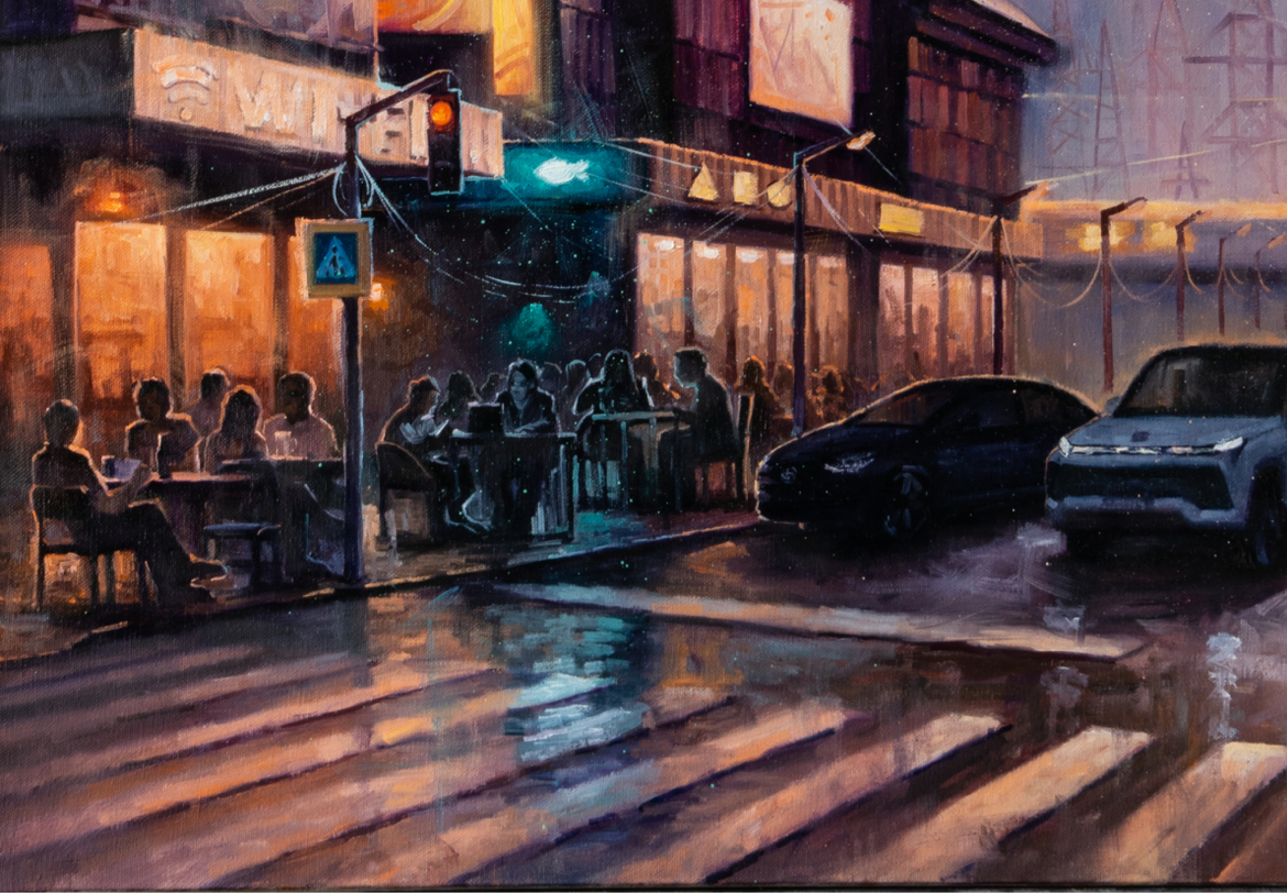Художница из Екатеринбурга Альфия Шайхулова вдохновлялась своим родным городом. Мегаполис на картине опоясывают линии электропередач, которые несут скоростной интернет фрилансерам с гаджетами, водителям с навигаторами в смартфонах и людям, которые встречаются в кафе с друзьями. Неоновые баннеры на зданиях превращают Екатеринбург в футуристический город будущего.