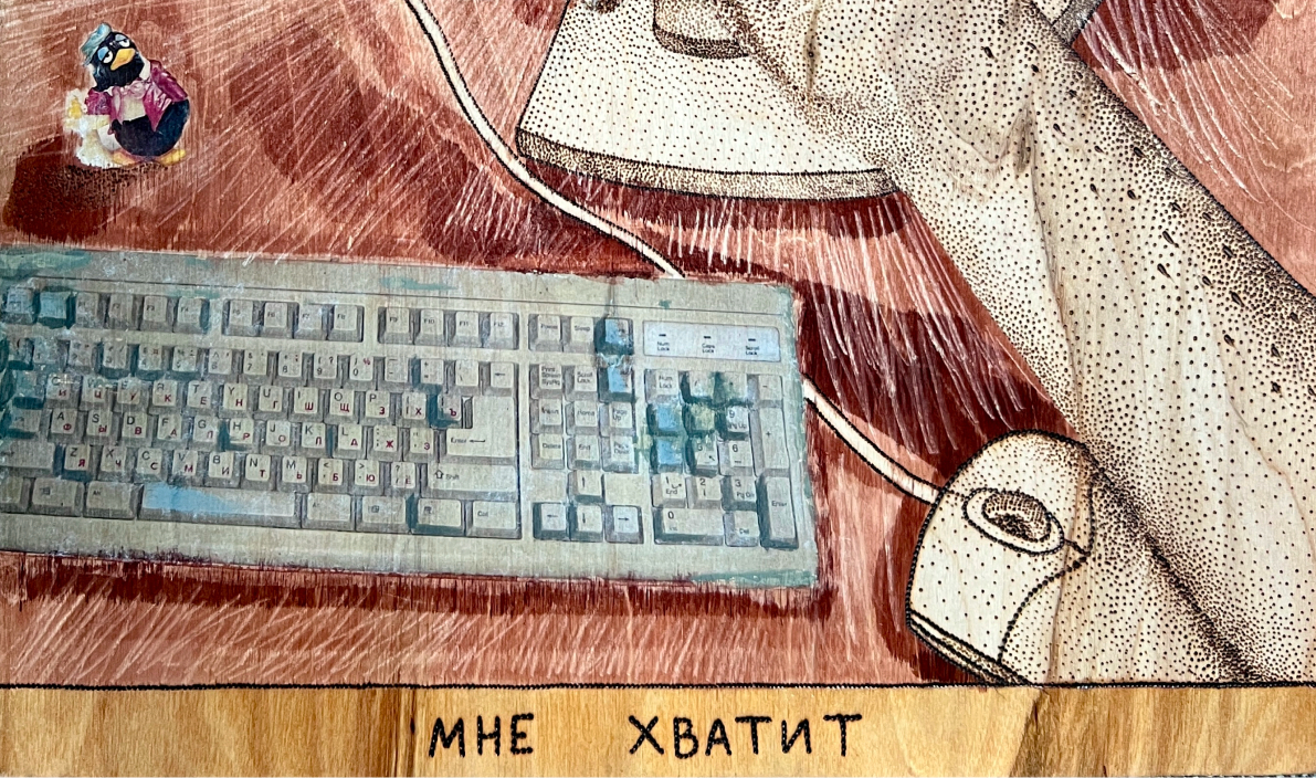 Кирилл Манчунский изобразил Рунет 1990-х в ироничной манере. На доске выжжена рука интернет-пользователя на фоне компьютера, в руке — карточка для доступа в интернет на 30 секунд. Внизу колкая надпись: «Мне хватит». Многие помнят эти карточки, которые надо было где-то покупать и которые давали доступ к сети на три-пять часов.