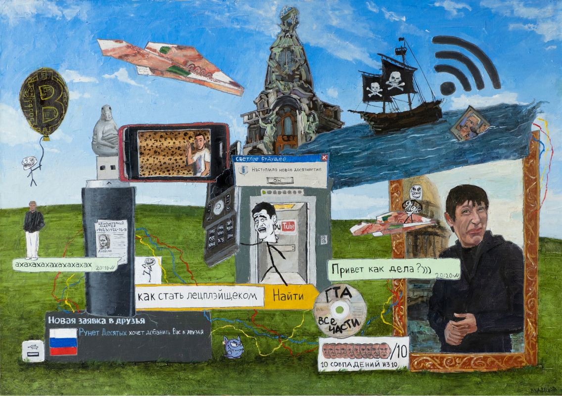 Даниил Кудряшов отразил в своей работе, посвящённой рунету 2010-х, коллаж из узнаваемых образов — событий, интернет-мемов, известных сообществ и шоу. Среди прочего на картине изображён «Дом Зингера», с которого в 2012 году основатель ВКонтакте Павел Дуров разбрасывал пятитысячные купюры.