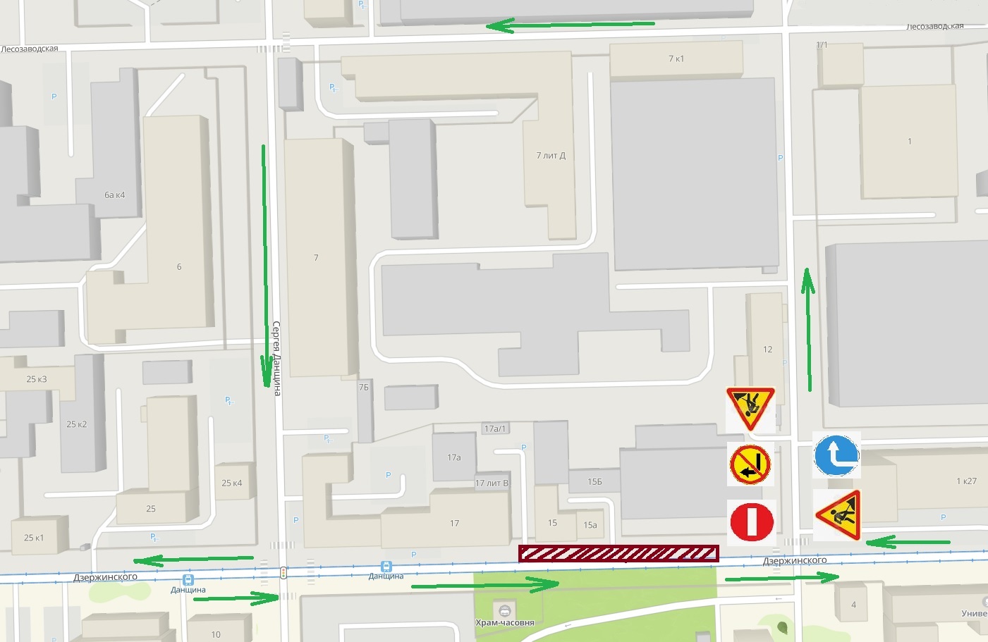 В зону работ попадает участок ул. Дзержинского от ул. Букирева до ул. Данщина. Полосу движения транспорта в сторону трамвайного депо перекроют с 08:00 17 июля до 24:00 21 июля.