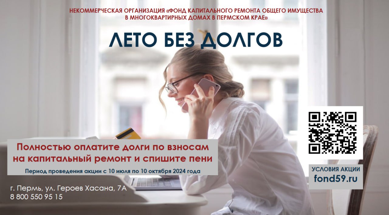 В период с 10 июля по 10 октября 2024 года Фонд капитального ремонта Пермского края проводит акцию «Лето без долгов». Воспользоваться условиями акции могут как физические, так и юридические лица.