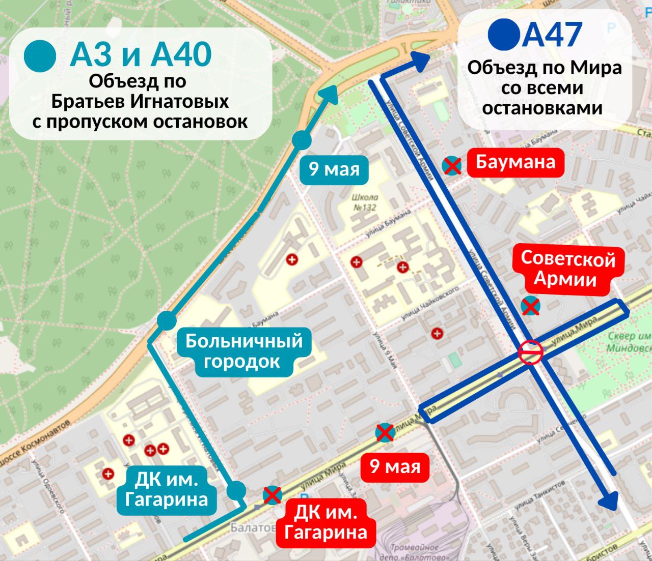 Кроме того, временно не будет остановок «ДК им. Гагарина» и «9 Мая» по ул. Мира, а также «Советской Армии» и «Баумана» по ул. Советской Армии.