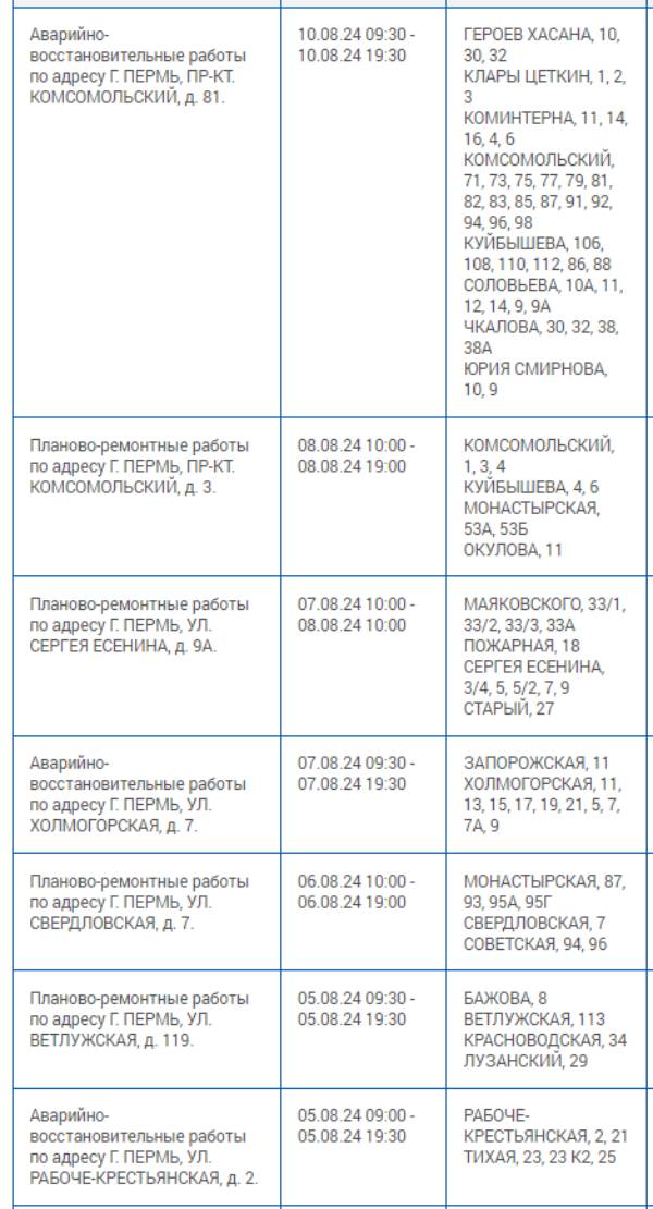 «Новогор-Прикамье» сообщает, где на следующей неделе, с 5 по 10 августа, запланированы работы, которые, потребуют временного отключения водоснабжения в отдельных домах Перми. Уточняется, что сотрудники водоканала будут проводить как аварийно-восстановительные, так и планово-ремонтные работы. Некоторые отключения проведут в выходные, чтобы не нарушать работу социальных учреждений.