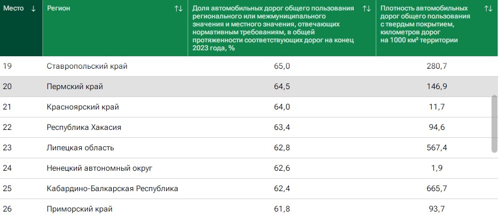 В Пермском крае доля автомобильных дорог общего пользования регионального или межмуниципального и местного значения, которые отвечают нормативным требованиям, в общей протяжённости составила 64,5%. А плотность автодорог общего пользования с твёрдым покрытием — 146,9 км на 1 тыс. кв. км.