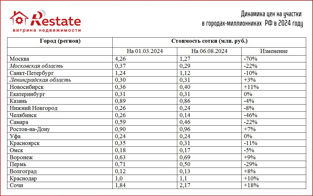 Сильный рост отмечен лишь в Сочи. Цена сотки прибавила за весну и лето 18%, достигнув средней стоимости 2,17 млн руб.