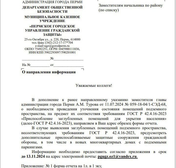 В telegram-канале пермских ветеранов СВО «Прикамские витязи» 21 августа был опубликован документ о направлении информации от МКУ «Пермское городское управление гражданской защиты». Данное письмо было направлено в дополнение к высланному ранее указанию заместителя главы администрации Перми Алексея Турова от 11 июля с указанием проверить подвалы. По данным авторов канала, письма были направлены управляющим компаниям.