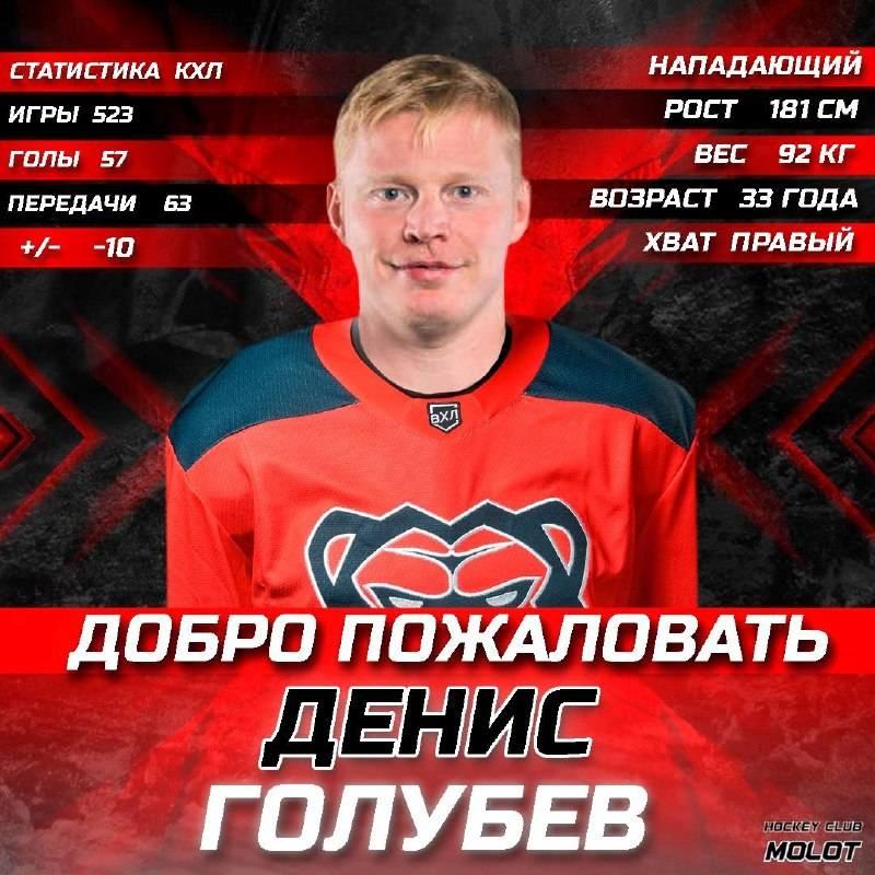 Состав пермского хоккейного клуба «Молот» пополнил 33-летний нападающий Денис Голубев. Об этом сообщили в пресс-службе ХК.