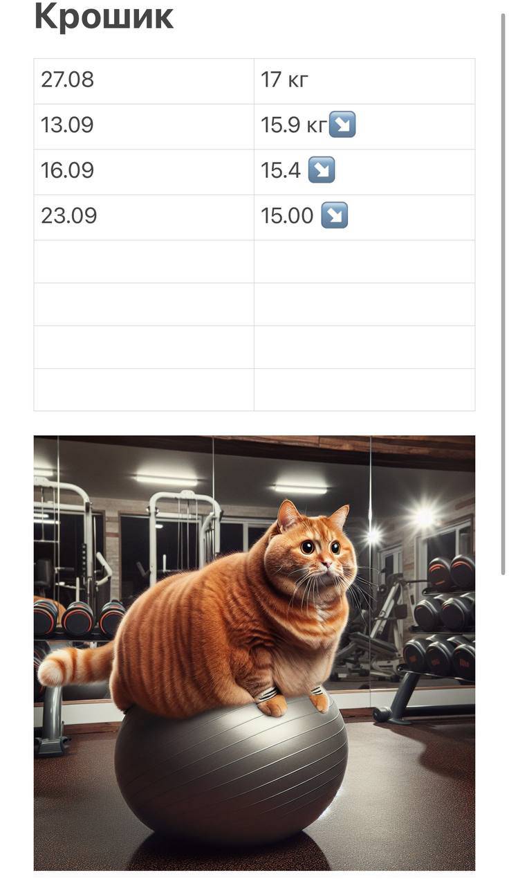 Кот по кличке Крошик из Перми, который в августе весил 17 кг, за месяц соблюдения диеты и физических упражнений сбросил 2 кг, сообщает телеграм-канал «Мысли реабилитолога. VetRehab_Dogmas».
