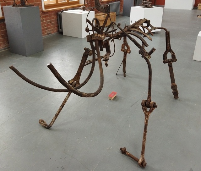 Олег Филимонов собирает свои работы из исторического лома. Элементами объектов становится архитектурное железо, среди которого решётки, крепления, арматура.