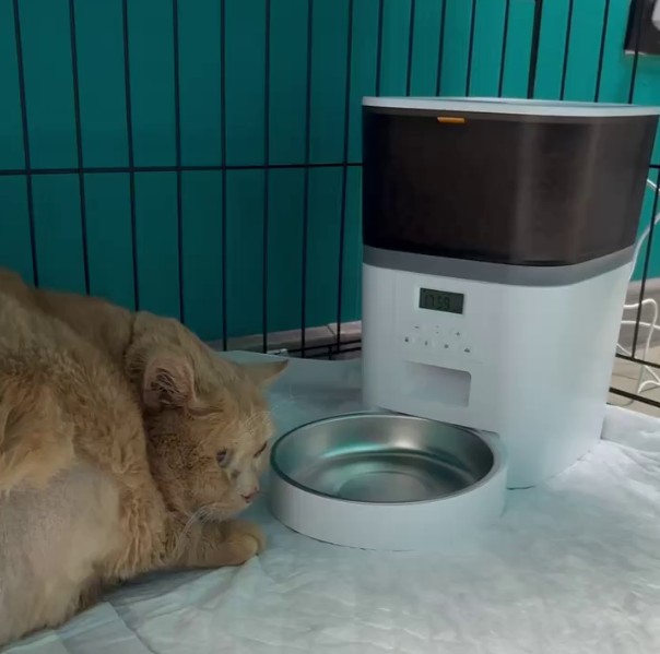 Ветеринар разместила видео, где при выдаче новой порции аппарат призывает кота к еде, повторяя фразу: «Крошик, пора кушать!»