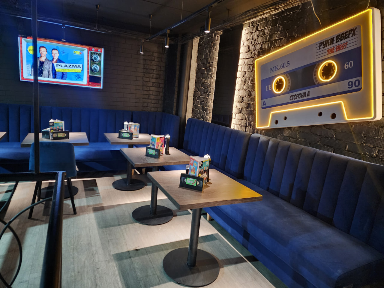 Интерьер оформлен в соответствующей стилистике: здесь есть стена, выложенная, как плиткой, магнитофонными кассетами; есть неоновая инсталляция в виде октябрятской звёздочки, где вместо кудрявого Володи Ульянова — Сергей Жуков, солист группы «Руки ВВерх!» и основатель сети баров; есть даже ковёр, висящий на стене: не топтать же ногами такую дорогую и дефицитную для «лихих годов» вещь!