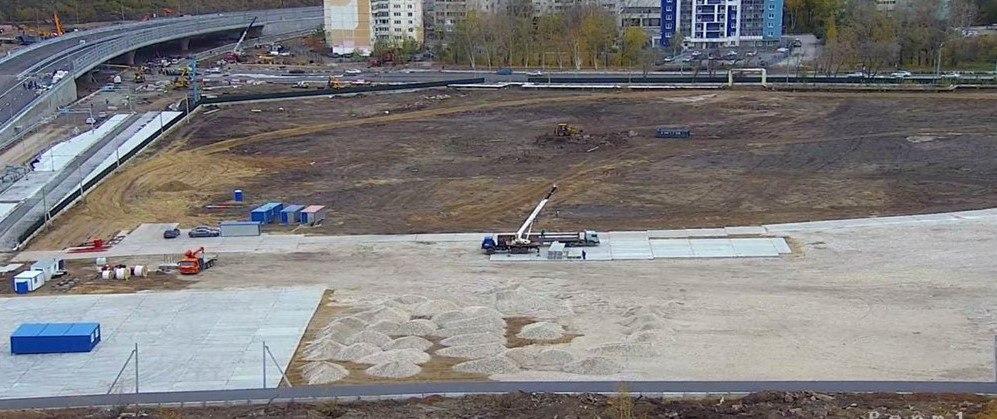 На сегодняшний день практически завершилось устройство ограждения строительной площадки. По периметру будущей арены подрядчик укладывает временные проезды из железобетонных плит, организовывает примыкания площадки с улично-дорожной сетью. Кроме этого, формируется щебёночное основание для строительного городка.