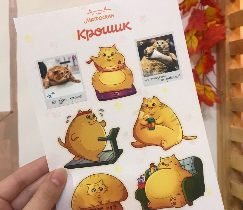Команда приюта для бездомных кошек «Матроскин» сделала стикерпак с изображениями кота Крошика. Как рассказала «Новому компаньону» основательница «Матроскина» Галя Море, стикеры нарисовала сотрудница котокафе Диана, молодая художница. Её вдохновила история Крошика, и она предложила нарисовать наклейки.