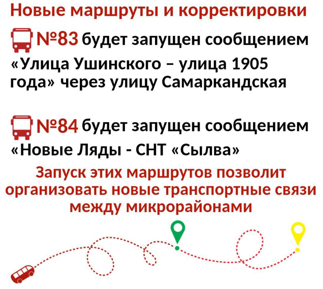 В Перми администрация планирует организовать работу двух новых автобусных маршрутов — № 83 и 84. Первый будет курсировать от ул. Ушинского до ул. 1905 года через ул. Самаркандскую, а второй запустят от Новых Лядов до СНТ «Сылва». Об этом сообщает ТК ВЕТТА.