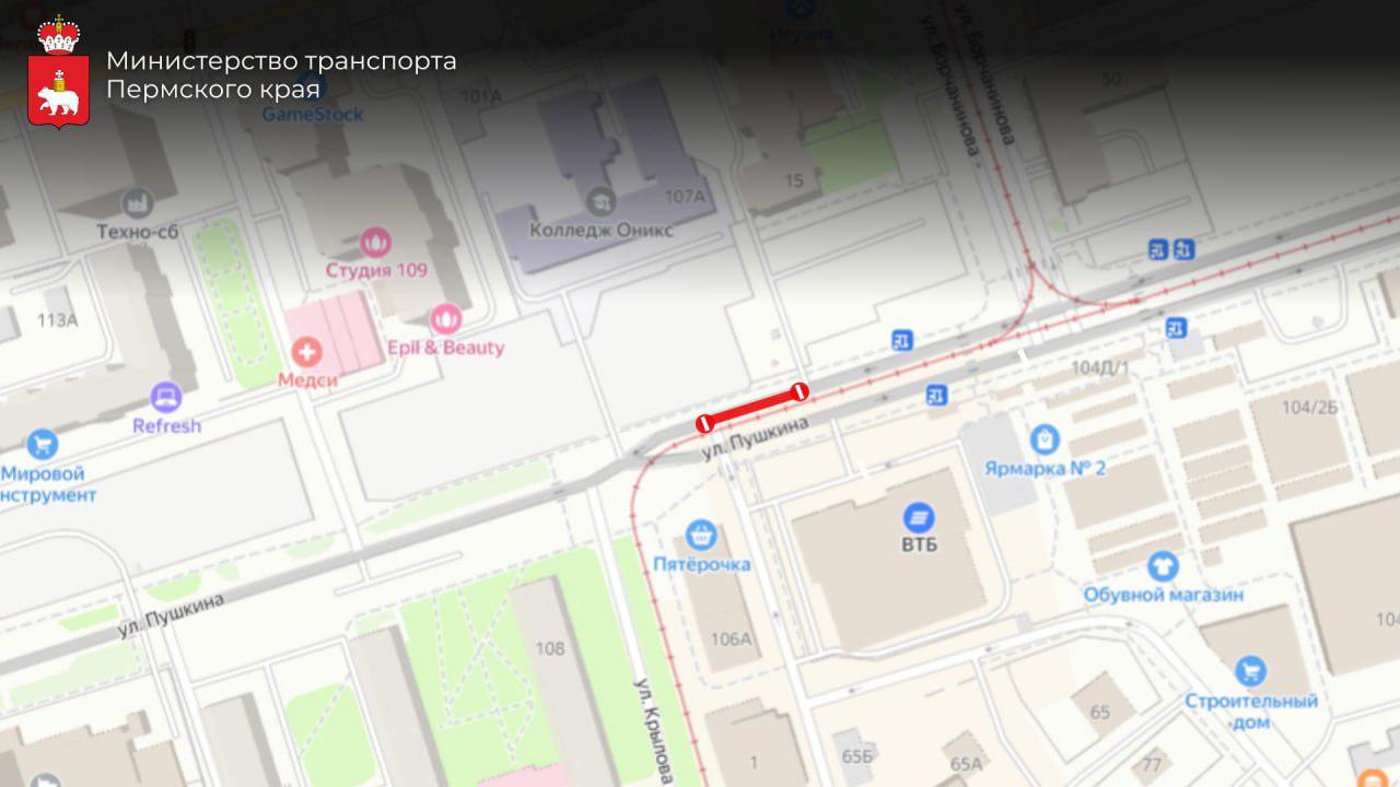 В Перми на участке ул. Пушкина от ул. Борчанинова до ул. Крылова будет временно сужена проезжая часть. Об этом сообщили в региональном министерстве транспорта.