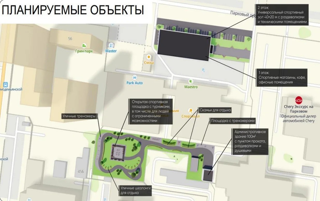 ООО «Развитие Арена» планирует построить на бульваре Гагарина, 88а многофункциональный спорткомплекс с медиафасадом общей площадью около 8 тыс. кв. м. Он будет состоять из футбольного манежа для тренировок детских команд — не менее 3,2 тыс. кв. м, универсального зала для игровых видов спорта и спортивной гимнастики, тренажёрного зала, а также залов для фитнеса, аэробики, единоборств и киберспорта. Помимо этого, в составе комплекса появятся медицинский центр, магазины и кафе.