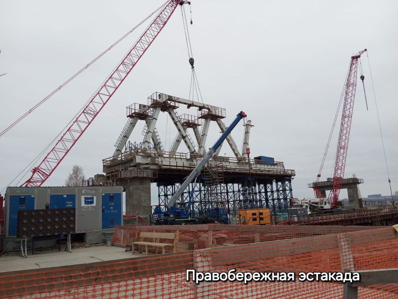 В данный момент ведётся монтаж пролётных строений, а в русловой части рабочие приступили к бетонированию опор. Сейчас из 13 готовы уже две, продолжаются работы ещё по четырём опорам.