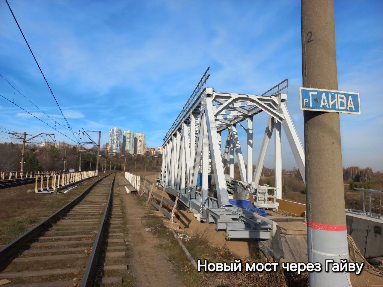 «На правом берегу возвели железнодорожный мост через Гайву. Он станет частью пути, который соединит эстакадный подход моста через Каму со ст. Кабельная. Ведём на станции реконструкцию ж/д путей и контактной сети», — добавили в компании.