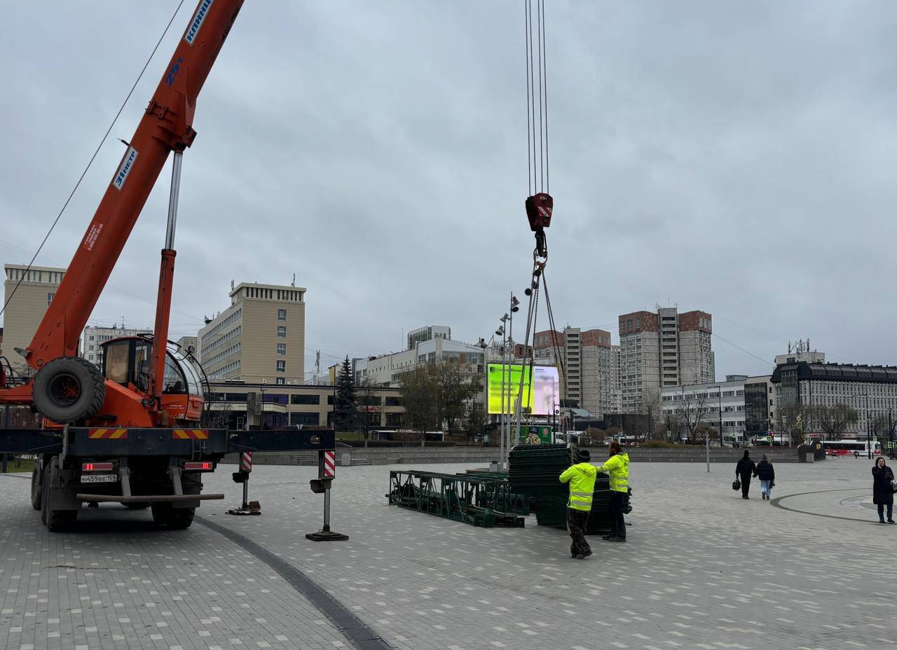 В Перми на эспланаде приступили к установке главной новогодней ёлки. Началась сборка её основания и ограждений. Об этом пишет тг-канал краевого парламента.