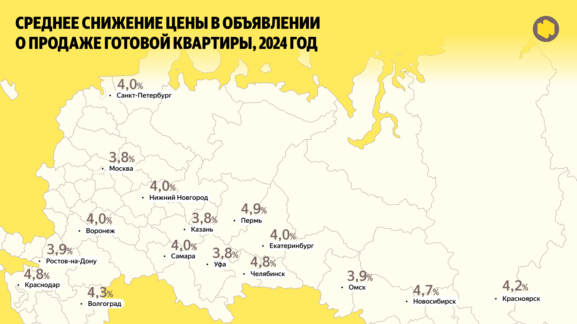 Как сообщают аналитики, уровень скидок на «вторичку» увеличился почти во всех российских мегаполисах. Наибольший рост зафиксирован в Перми и Челябинске, где в среднем собственники снижают цены на 4,9 и 4,8% соответственно (+1,4% за год). На втором месте Красноярск и Самара — 4,2 и 4% соответственно (+1% за год), а на третьем оказался Новосибирск — 4,7% (+0,8%).