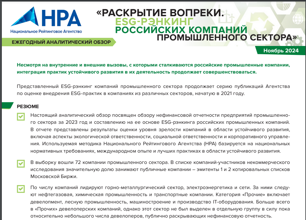 В итоговый список вошли 72 компании промышленного сектора, которые публиковали отчёты по устойчивому развитию за 2023 год.