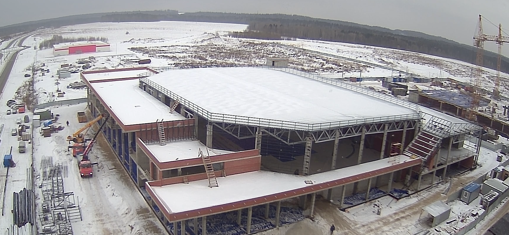 На данный момент объём выполненных работ на объекте составляет 27%. Подрядчик завершил работы по устройству железобетонных конструкций фундаментов, монолитного каркаса и перекрытий здания, смонтировал металлические конструкции и покрытие кровли из профлиста. Продолжается монтаж металлических конструкций подвесной системы фасадов здания, изготавливаются трёхслойные сэндвич-панели, витражные конструкции, ведётся устройство монолитной плиты. В декабре рабочие приступят к монтажным работам по устройству кровли.