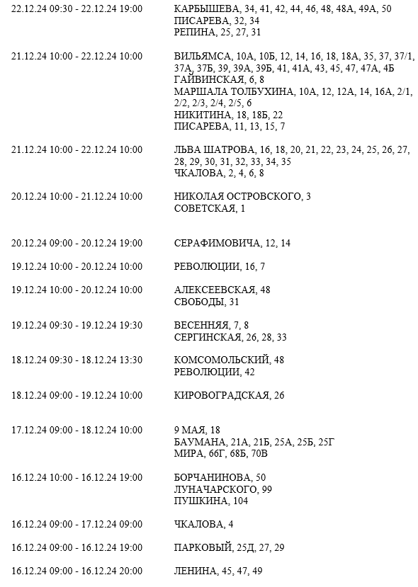 Слева в таблице обозначены сроки отключений, справа — адреса домов, которые останутся без воды. Сведения размещены в обратном порядке, начиная с самых поздних.