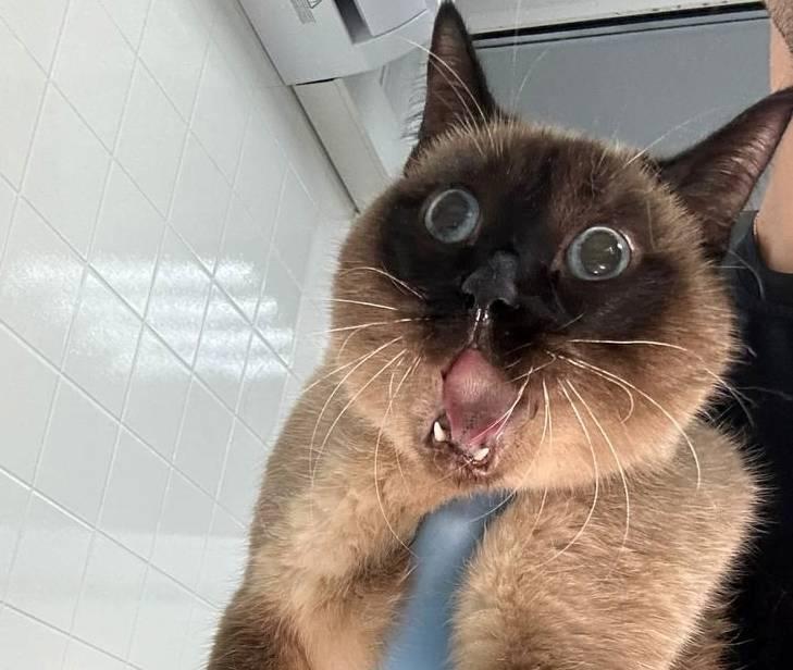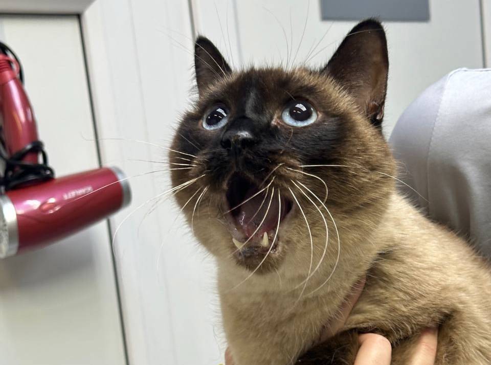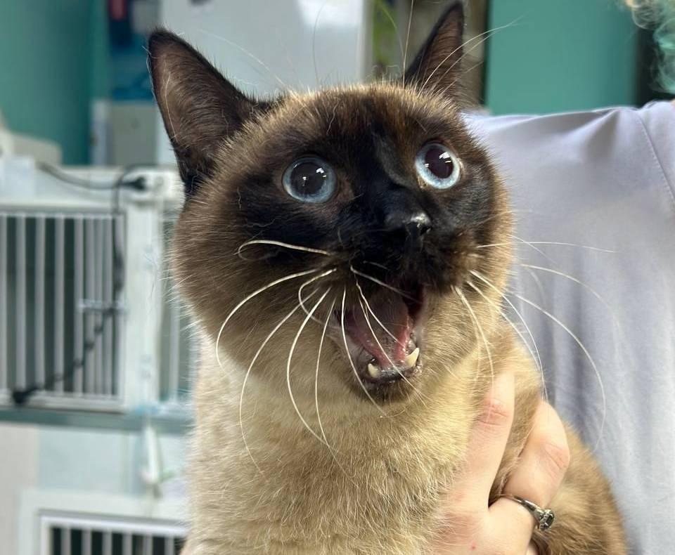 В пермскую ветеринарную клинику «Друг» поступил 10-летний сиамский кот по кличке Лёва с необычной травмой. Как рассказали хозяева животного, ночью он упал со стола, причём весьма неудачно, а утром они обнаружили своего питомца с открытой пастью, словно он очень удивлён.