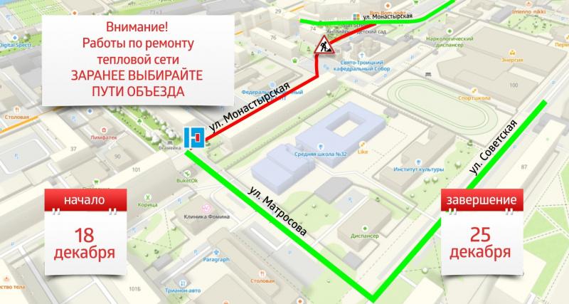 Проезд будет запрещён для всех видов транспорта с 18 до 25 декабря по ул. Монастырской, 93в (напротив Слудской церкви). Объехать участок можно по улицам Матросова, Советская, Окулова и Крисанова.