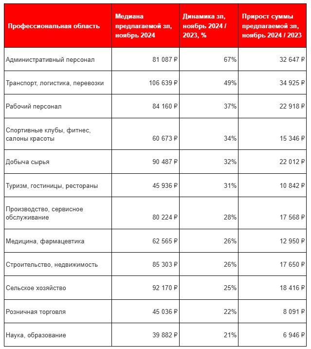 Следующими по динамике прироста предлагаемых зарплат идут сферы «Транспорт, логистика, перевозки» (+49%, до 106 639 руб.), «Рабочий персонал» (+37%, до 84 160 руб.), «Спортивные клубы, фитнес, салоны красоты» (+34%, до 60 673 руб.). Далее идут «Добыча сырья» (+32%), «Туризм, гостиницы, рестораны» (+31%), «Производство, сервисное обслуживание» (+28%), «Медицина, фармацевтика» (+26%), «Строительство, недвижимость» (+26%), «Сельское хозяйство» (+25%), «Розничная торговля» (+22%), «Наука, образование» (+21%).