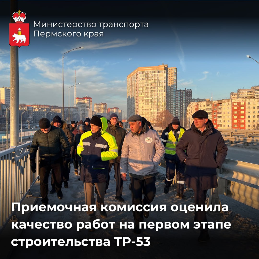 Специальная комиссия провела проверку первого этапа строительства дороги ТР-53 в Перми. В состав комиссии вошли представители министерства транспорта и управления автомобильных дорог Пермского края.