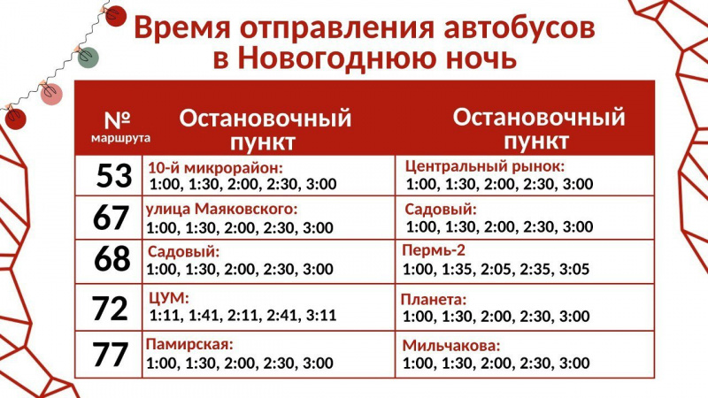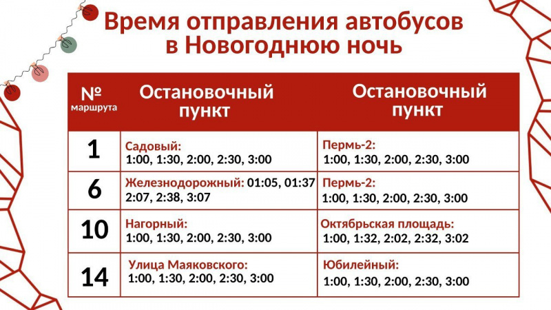 В городском транспортном департаменте сообщили, что в новогоднюю ночь в Перми автобусы и трамваи будут работать до 4:00 по основным маршрутам. При этом 31 декабря все маршруты общественного транспорта будут функционировать по выходному расписанию с последними отправлениями до 23:00.