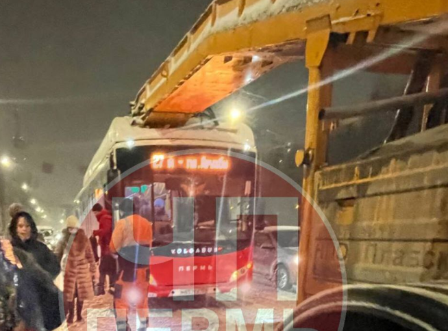 В Мотовилихинском районе на бульваре Гагарина автобус маршрута №27 врезался в снегопогрузчик. Фотографию инцидента опубликовал телеграм-канал «ЧП Пермь».