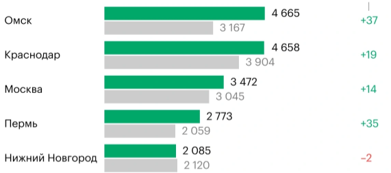 Лидером по снижению стал Новосибирск, где за год сумма среднего чека уменьшилась на 11%. Также снижение зафиксировано в Ростове-на-Дону (-9%), Самаре (-6%), Челябинске (-3%) и Нижнем Новгороде (-2%).