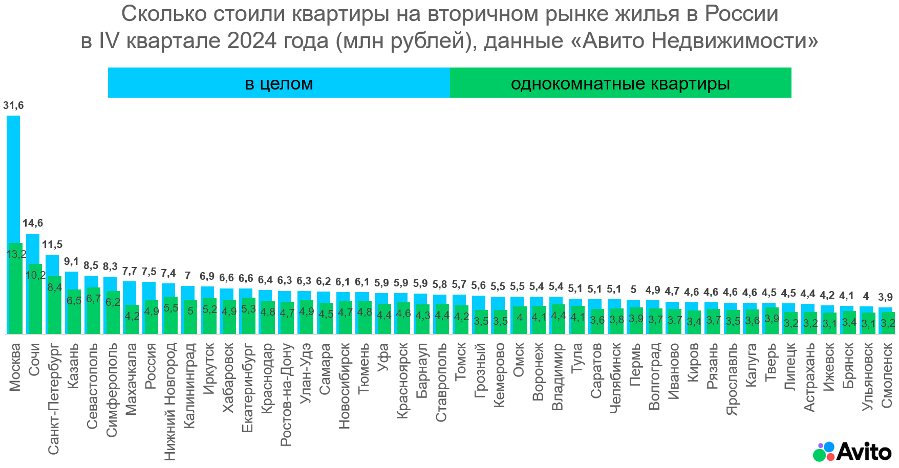 Исследование также показало, что самые дешёвые «вторички» были представлены в Смоленске (3,9 млн руб.), Ульяновске (4 млн руб.) и Брянске (4,1 млн руб.). Самые дорогие, ожидаемо, оказались в Москве (31,6 млн руб.), Сочи (14,6 млн руб.) и Санкт-Петербурге (11,5 млн руб.).