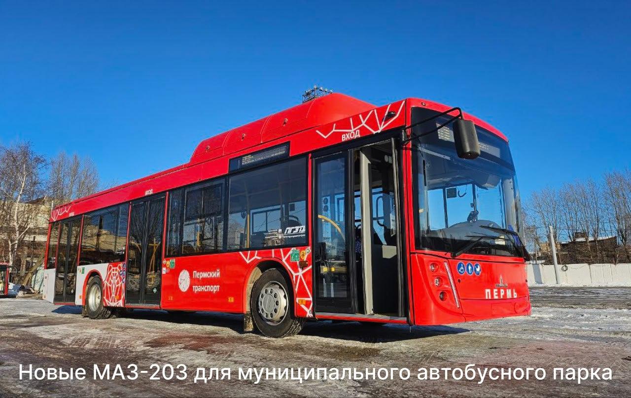 Для муниципального автопарка МУП «Пермгорэлектротранс» в краевой центр доставлено пять новых автобусов большого класса модели МАЗ-203, каждый из которых может перевозить по 105 пассажиров. Всего в муниципальный автопарк прибудут девять таких машин. Об этом сообщил глава Перми Эдуард Соснин.