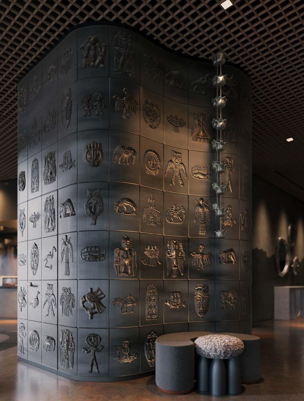 «Видим пермский звериный стиль, много меди, мозаику с фольклорными мотивами. Что интересно — дизайнеры интерьеров приезжали в Пермский край в экспедицию для поиска референсов и вдохновения», — написал Папулов.