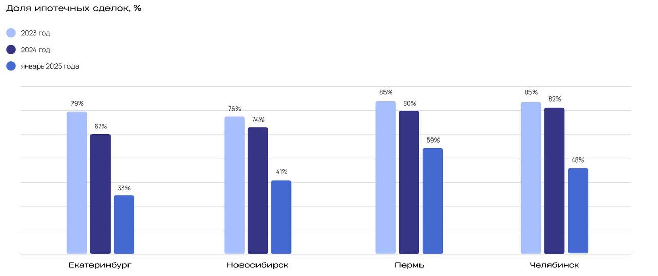 В январе под влиянием высоких ставок и изменения субсидированных программ количество ипотечных сделок снизилось до рекордного уровня за последние годы. В Перми доля сделок с привлечением кредитных средств по договорам долевого участия в январе 2025 года составила 59%, тогда как в 2024-м было заключено 80% таких сделок, а в 2023-м — 85%.