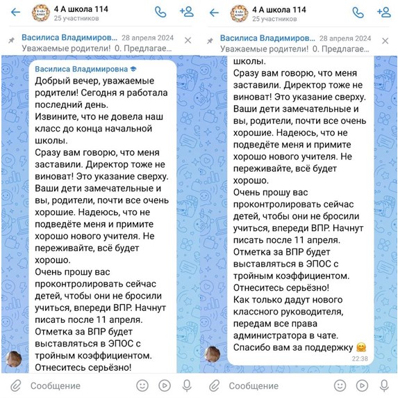 Позже, 16 февраля, Александре написала другая учительница этой школы и сказала, что Василису Чистову уволили, а её классы отдали другим педагогам.