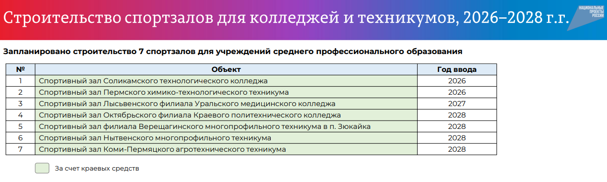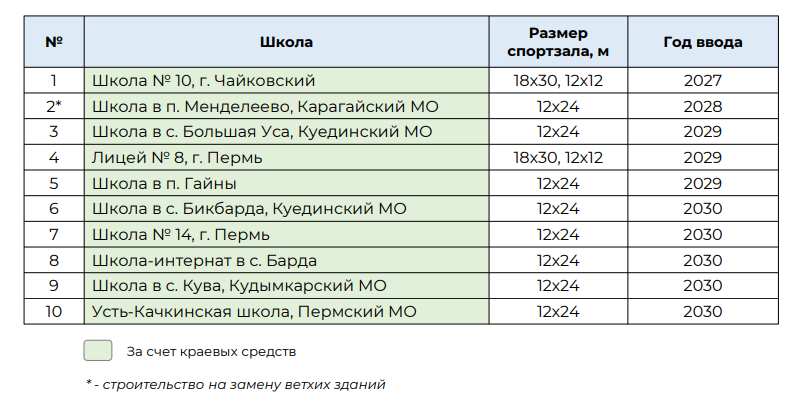 Чиновница пояснила, что строительство спортивных залов для школ — новое и системное направление в деятельности региональных властей. В течение пяти лет планируется возвести 10 спортобъектов в разных территориях края: в Перми и Пермском округе, в Чайковском, Барде, Гайнах, а также в Карагайском, Кудымкарском и Куединском округах.