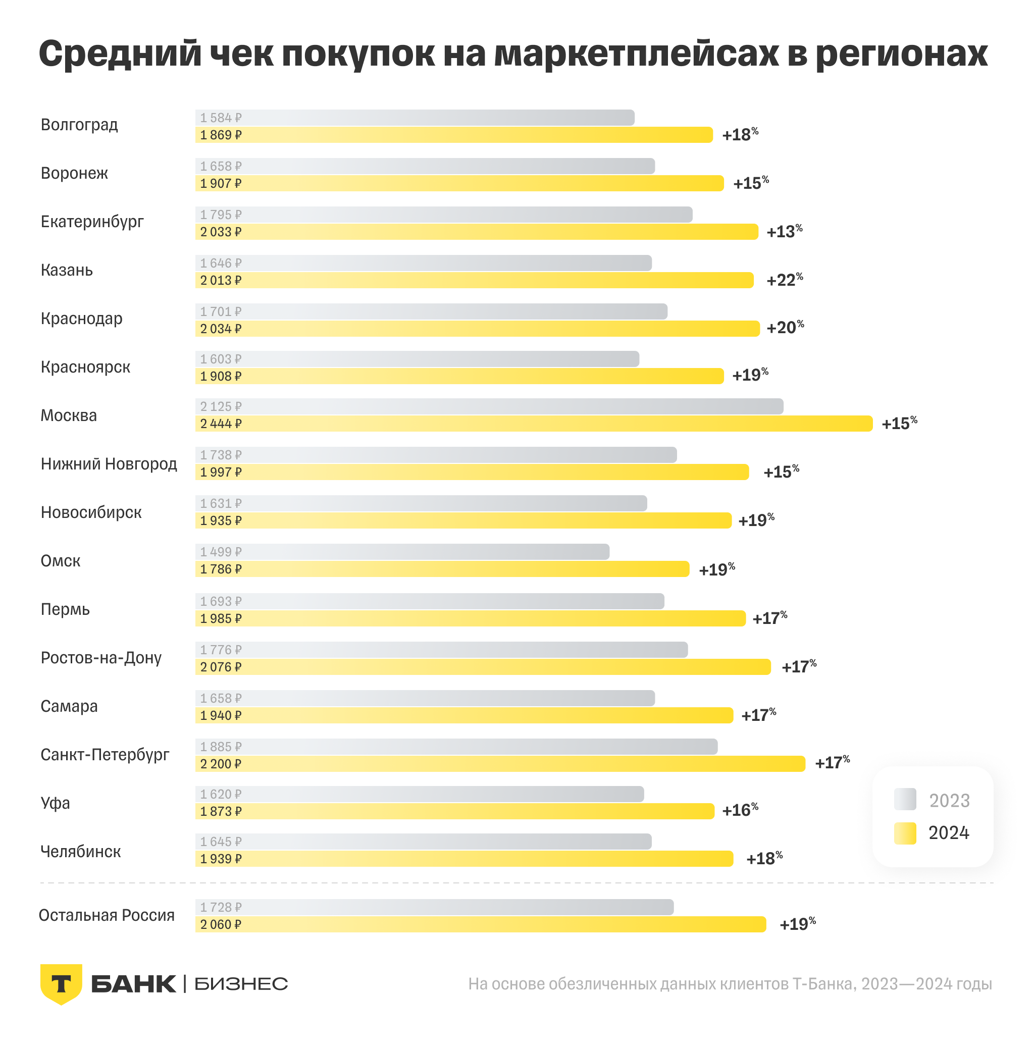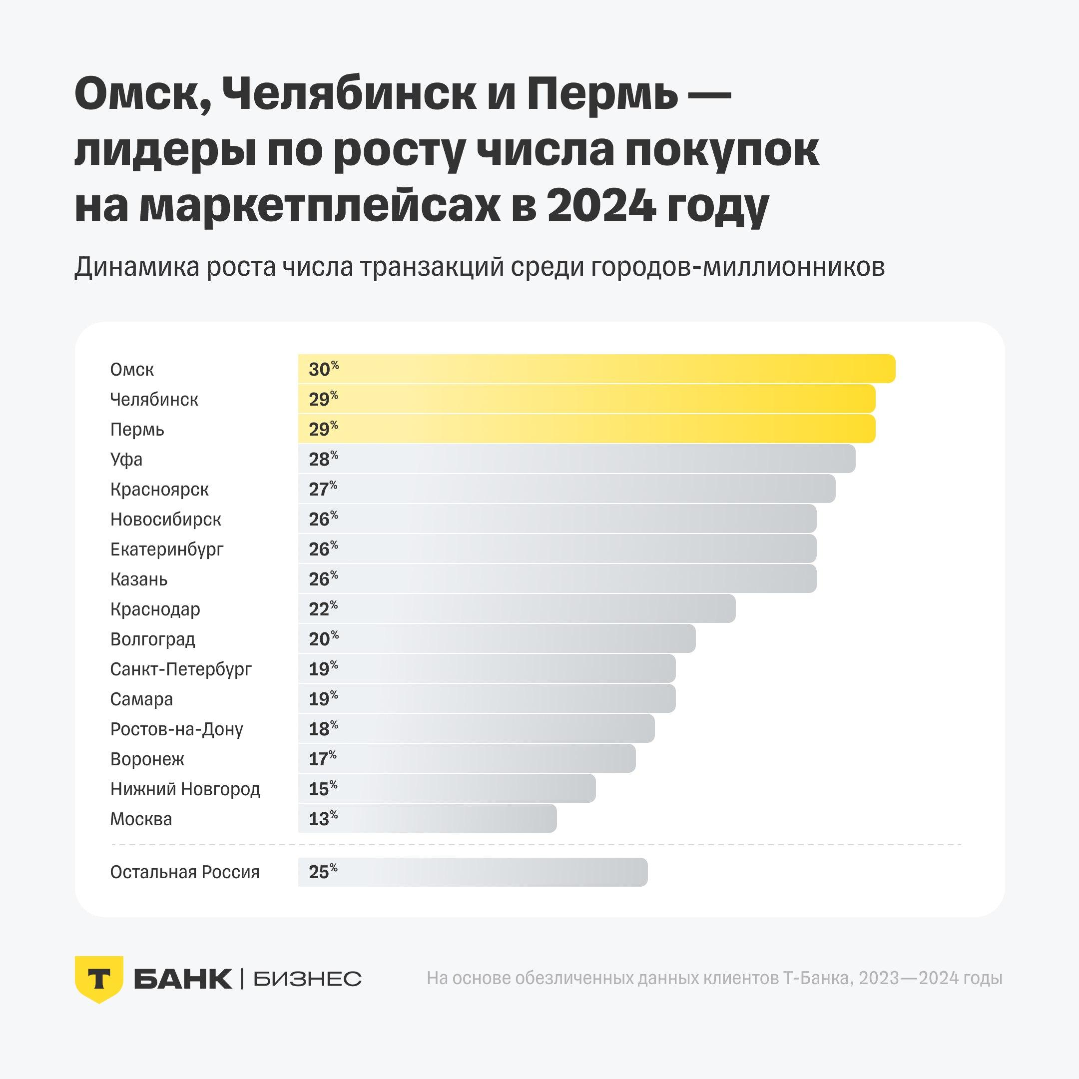 Параллельно с этим в 2024 году рос и общий объём трат на покупки. Больший прирост оказался снова у Омска (+55%), второе место заняла Казань (+54%). В пятёрку лидеров вошли Челябинск и Красноярск (по +52%) и Пермь (+51%). В Екатеринбурге динамика оборотов показала рост на 48%, как и в среднем по России, в Петербурге — на 39%, в Москве — на 30%.