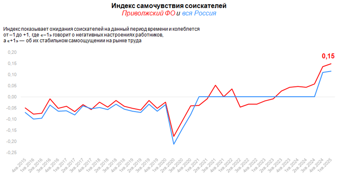 Интегральный показатель самочувствия соискателей на рынке труда формируется на основе шести факторов, включая наличие или отсутствие риска увольнения на текущей работе, трудности в поиске работы по специальности, готовность к гибкости и снижению зарплатных ожиданий. Более высокое значение индекса (ближе к единице) указывает на уверенность соискателей, в то время как отрицательные значения отражают пессимистичные оценки перспектив.