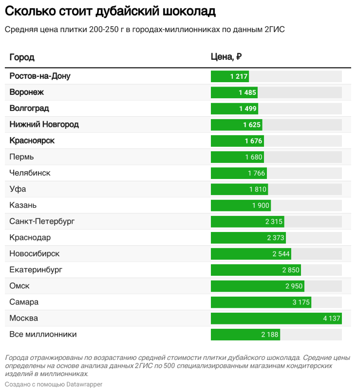 2ГИС добавил информацию о российских кондитерских, где продаётся дубайский шоколад. Аналитики, используя эти данные, провели сравнение средних цен на 200-граммовую плитку этого шоколада в 16 крупных городах России. Отмечено, что популярность шоколада, взлетевшая в прошлом году благодаря соцсетям, переживает новый всплеск (число поисковых запросов на картах российских городов к марту 2025 года увеличилось на 20% за последние два месяца, почти достигнув пика октября 2024 года).